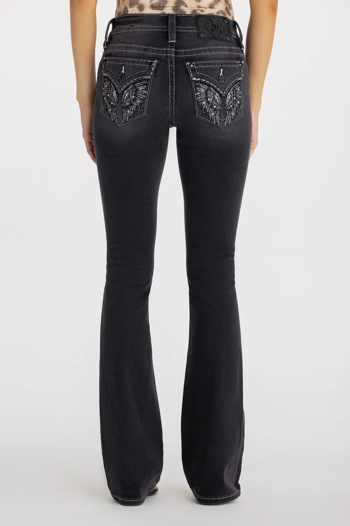 Tζιν MISS ME mid-rise, boot σε σκούρο γκρι χρώμα με φτερά. Τα αγαπημένα σας Miss Me jeans με υπέροχα ξεβάμματα και κεντήματα. Καταπληκτική εφαρμογή.